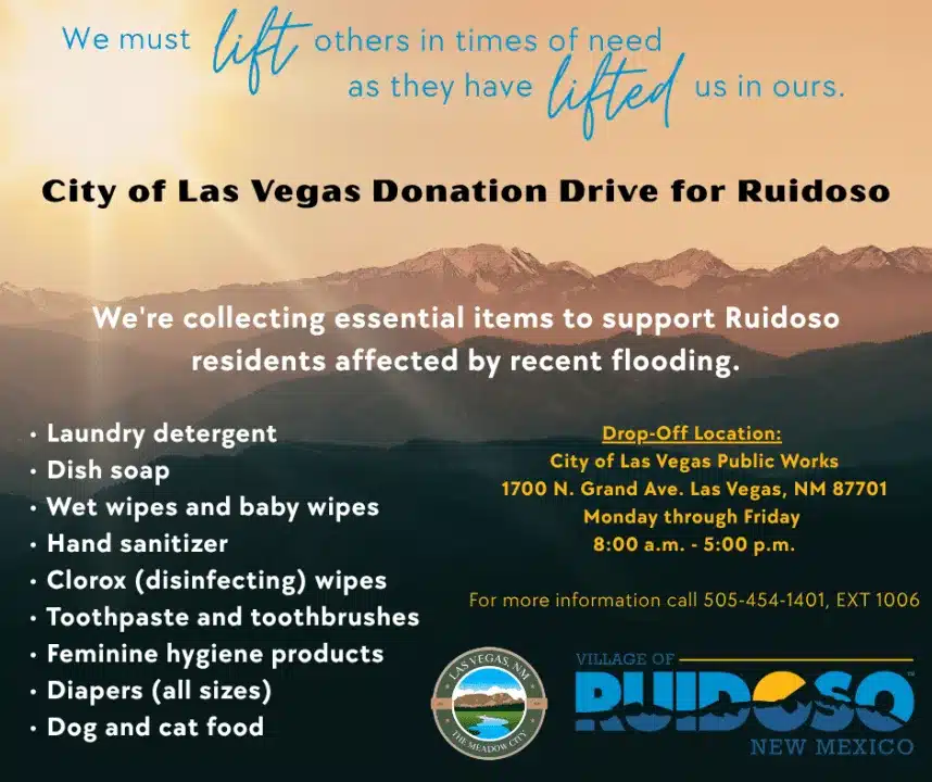 La ciudad de Las Vegas está recibiendo donaciones para los residentes de Ruidoso afectados por las inundaciones. Los funcionarios municipales expresaron su deseo de corresponder a la generosidad que otros les brindaron.
