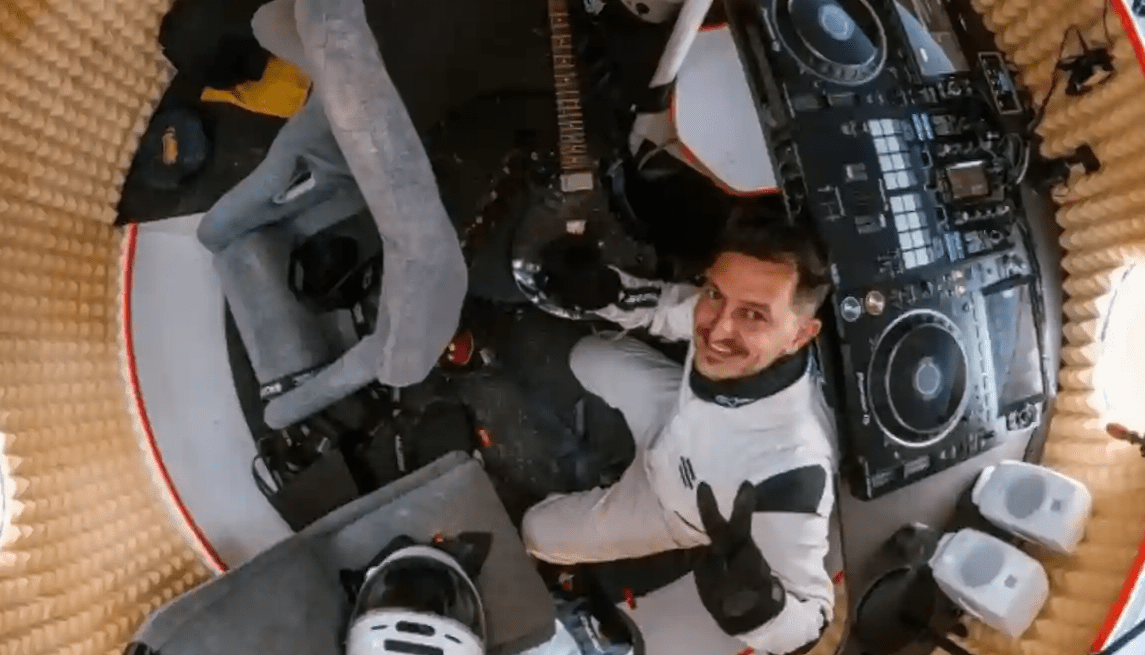 La actuación se llevó a cabo dentro de una cápsula presurizada, equipada con una mesa de mezclas y una ventana que permitía observar la curvatura del planeta.